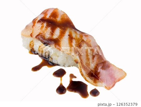 Grilled bacon sushi nigiri with sauce on white background
