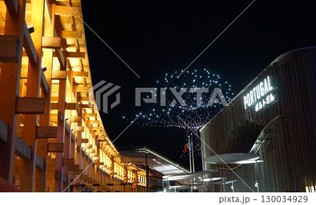 從大阪關西世博會的大屋頂環上眺望美國館和法國館