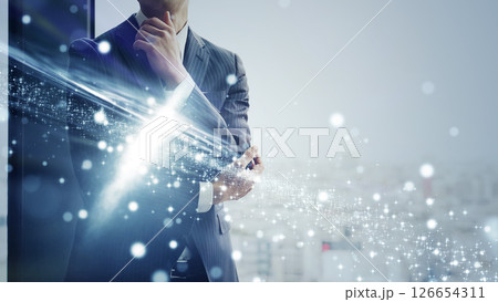 商務人士在辦公室思考科技概念橫幅和廣告的水平視覺