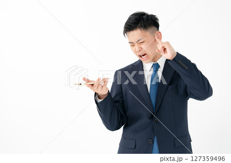 Digital Life Exploration. A focused businessman in dark blue suit reading text message on mobile phone.