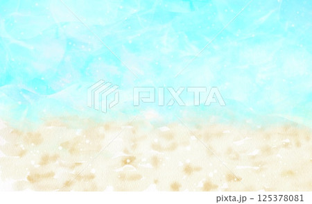 波光粼粼的大海和沙灘。海岸的水彩畫。