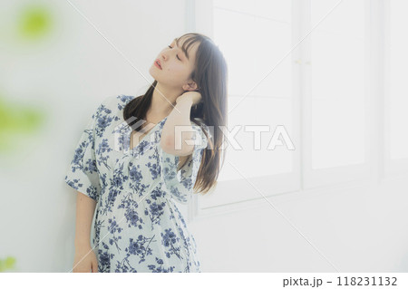 微笑的女人站在客廳的窗邊