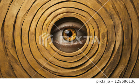 Golden eye peering through concentric wooden rings with mysterious and intense gaze