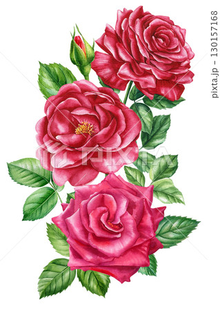 Red rose. Beautiful Flowers and leaves isolated on white background. Watercolor hand draw flora. Bouquet flowers