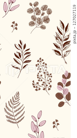 Seamless floral pattern with soft peach and cream flowers, green leaves, and delicate stems creating gentle and charming design