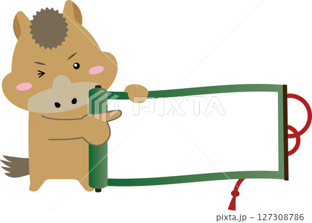 新年插圖,其中的馬角色指向捲軸和訊息框(裸馬版)