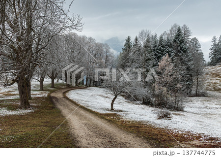 Curving dirt path through frosty trees in quiet winter countryside