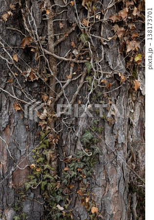 Tree Bark with Dry Vines and Ivy Leaves