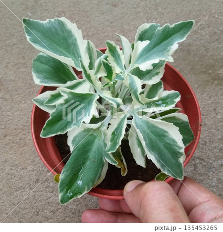 Variegated Kalanchoe Laciniata Houseplant with Fringed Green and White Succulent Leaves in Red Pot