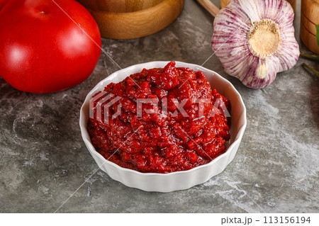 Tropical tamarind fruit without a shell, with visible seeds and inner pulp, in a galvanized tray on a wooden. Concept of food preservation in Thai style. Peeled tamarind is a ready-to-eat concept.