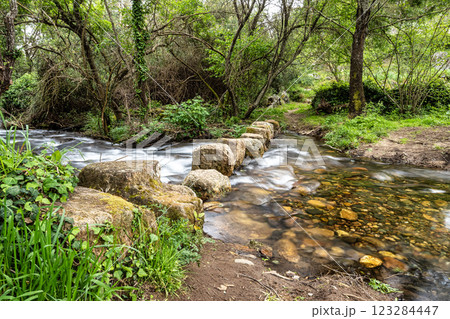 Walking across a bridge of stones over a stream at Percurso Pedestre de Galegos