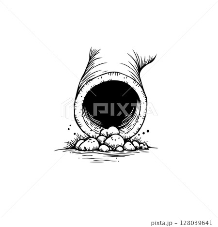 Monochrome depiction of a tunnel entrance filled with rocks and foliage detail