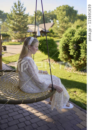 portrait of a young blonde woman in a pastel chiffon dress circling in a wicker hammock