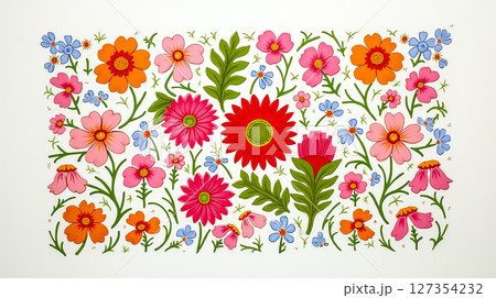Colorful floral pattern featuring various flowers and leaves on a white background
