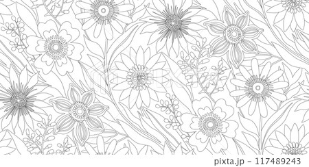 Half drop Floral Seamless Pattern of Fantasy Flower Field - Black thin Line Drawing on a White Background. Wallpaper Design for Textiles, Papers, Prints, Fashion, Wrappings, Coloring Pages.