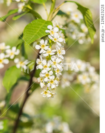 Beautiful pear tree flowers on branch in spring. Close-up of white inflorescences of pear tree.