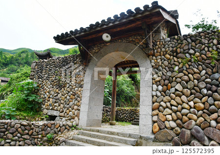 traditional Chinese style door on stone wall, China, Zhejiang Province