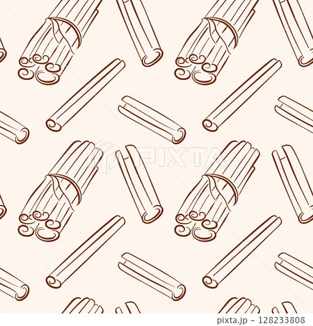 Line art style cinnamon stick seamless pattern. Exotic spice for store package, cafe menu design.