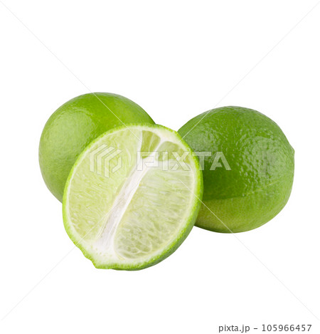 Whole and sliced limes, Sour green fruit isolated on a white background.