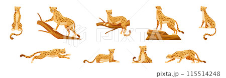 Cheetah as African Large Cat with Long Tail and Black Spots on Coat Vector Set