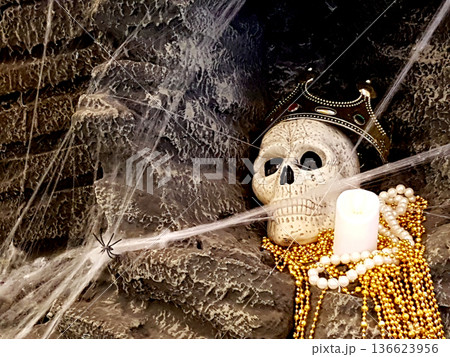 A human skull wearing a gold crown rests in a dark cave surrounded by thick cobwebs, a small spider, a white candle, and golden pearls. Spooky dungeon theme perfect for Halloween or gothic concepts.
