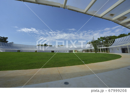 運動場的草坪和透光的玻璃建築物