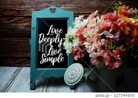 Love Deeply Live Simple text on easel chalkboard with flowers bouquet in metal vase decoration on wooden background
