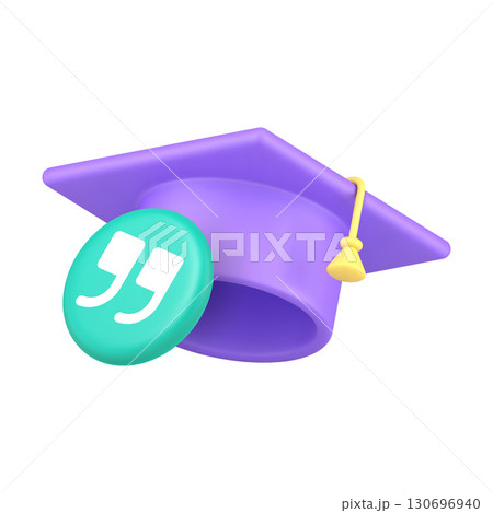 3D Realistic Icon Purple Graduation Cap And Green Quotation Marks For Education And Citation