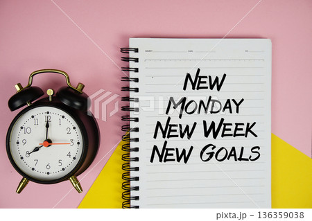 New Monday New Week New Goals text written on notepad with alarm clock on pink background
