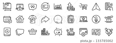 Wallet, Renew card and Shopping basket line icons pack. Share, Message, Paper plane icons. Technical algorithm, Inventory, Lock web icon. Power bank, Shopping cart, Box size pictogram. Vector
