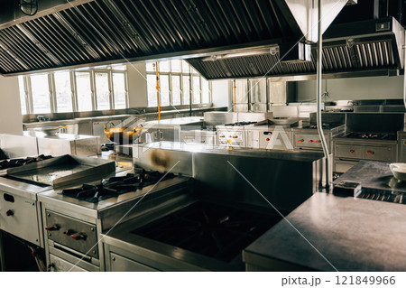 Professional kitchen in modern restaurant displays a shiny metal bowl on stove. Clean arrangement of equipment chrome appliances and new furniture. Bright gas service is working.