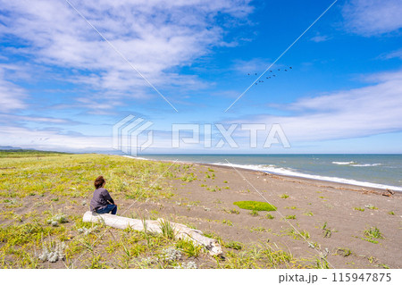 夏天的鄂霍次克海和草原,女人坐在浮木上看候鳥
