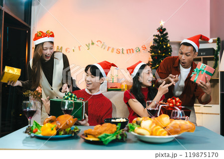 drinks and conversation, social gathering and get together at New Year young people, group and gift exchange at the event, celebration at home.