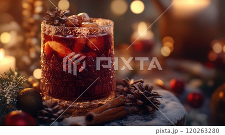 Close up View of a Festive Glass of Glogg with Warming Seasonal Garnishes