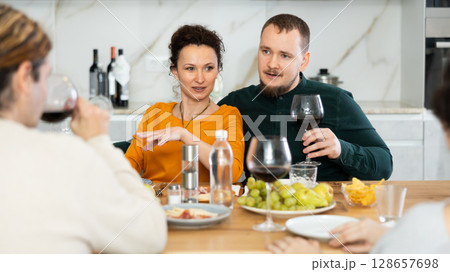 Group of joyful individuals are celebrating a holiday, enjoying drinks and conversation around table in their home