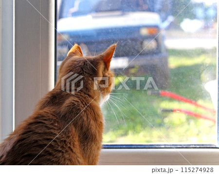 A red haired cat with a white mustache and belly is in the room and looks out the window at the car in the sunlight. Pet, portrait, interior, view, street view