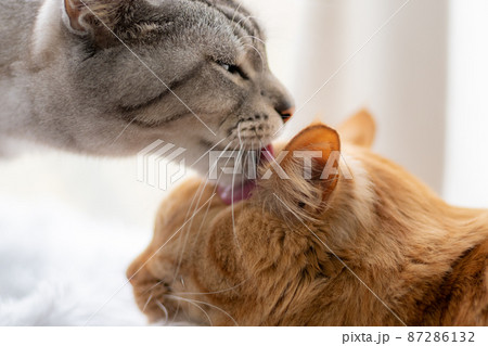 兩隻貓臉靠近:一隻黃虎斑貓和一隻鯖魚虎斑貓