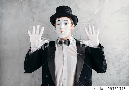 Serious mime male in white gloves and red hat looking at camera on orange background