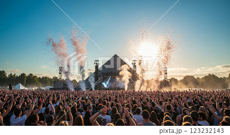 Selective focus of Silhouettes of people holding phones to take pictures at a concert, lights from a performance stage.