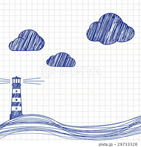 The lighthouse and the sea are drawn on paper.