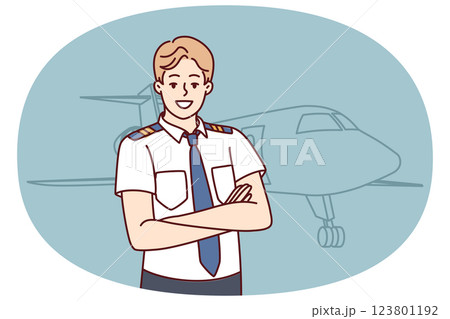 Man pilot of airplane stands with arms crossed near airliner inviting to buy new airline ticket