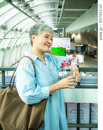 一名 60 歲的亞裔老婦站在公共案例中,端著一瓶水站在車站微笑。