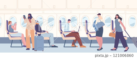 Passengers boarding plane. Travelers on aircraft board, people with suitcases and bags, sitting with laptops, sleeping. Flight vacations, vector scene