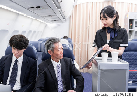 Cabin crew pushing service cart and serve to customer on the airplane during flight. hostess service on plane