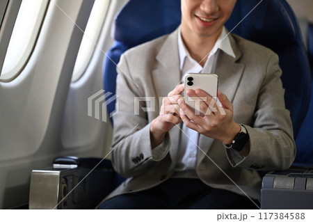 Successful asian businessman wearing suit using smartphone while sitting next to window in an airplane