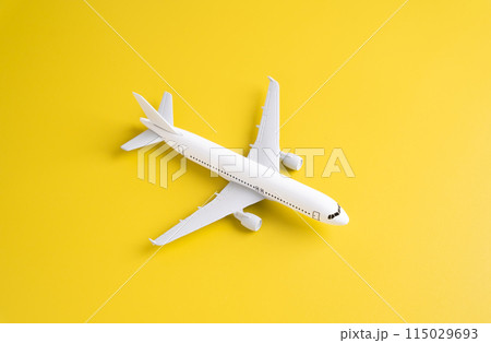 Passenger plane on a yellow background. Airplane figurine. Commercial flights