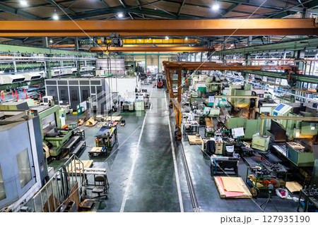 工廠內部鳥瞰圖,工廠內擺滿了成排的工具機