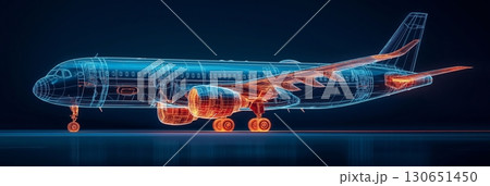Detailed 3D wireframe model of a commercial airplane showcasing aviation technology and design features