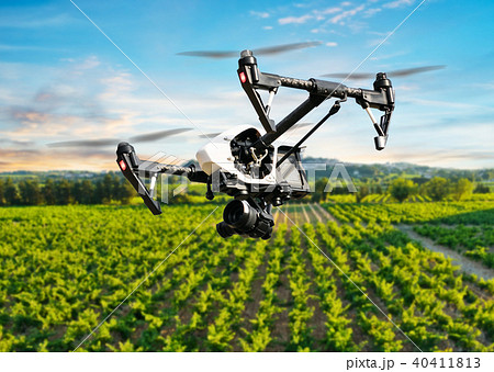 Monochrome Drone Graphic with Camera Over Lush Ground, Silhouette Design