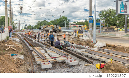 Repair works on the street timelapse. Laying of new tram rails on a city street.